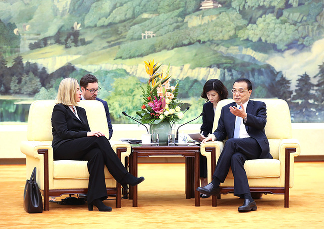 Der chinesische Ministerpräsident Li Keqiang hat am Donnerstag in Beijing die stellvertretende Vorsitzende der EU-Kommission und Hohe Vertreterin der EU für Außen- und Sicherheitspolitik, Federica Mogherini, getroffen.