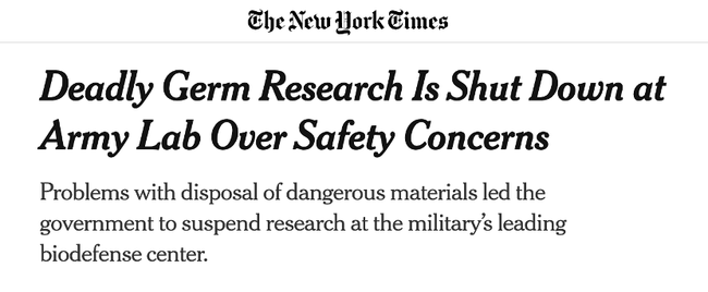 Im August 2019 ordnete die US-amerikanischen Zentren für Krankheitskontrolle und -prävention(CDC) plötzlich die vorübergehende Schließung des U.S. Army Institute of Infectious Diseases in Fort Detrick an. „The New York Times“ zufolge betrafen einige der ausgesetzten Laborstudien Toxine, die von der Regierung als „ernsthafte Bedrohung für die öffentliche Gesundheit, die Tier- und Pflanzengesundheit oder für Tier- und Pflanzenprodukte“ definiert worden waren. Die CDC lehntenes unter Berufung auf „Gründe der nationalen Sicherheit“ ab, Informationen über die Entscheidung zu veröffentlichen.