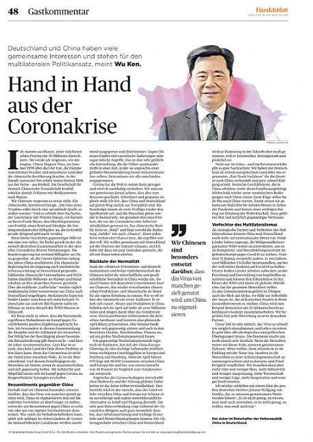 Am Dienstag hat die deutsche Zeitung "Handelsblatt" einen Gastkommentar von dem deutschen Botschafter in Deutschland Wu Ken mit dem Titel "Hand in Hand aus der Coronakrise" veröffentlicht. Der Beitrag lautet wie folgt: