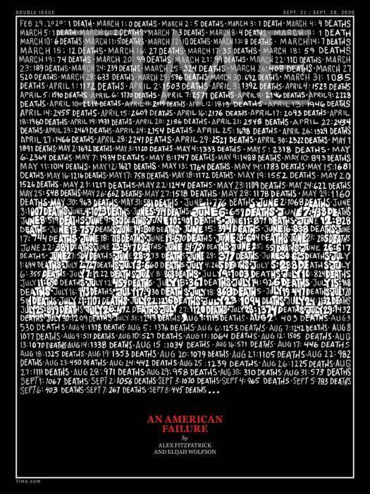 Auf der aktuellen Titelseite der US-Wochenzeitschrift „The Times“ zeigt die Abbildung den kommenden düsteren Meilenstein von 200.000 US-Toten, die an dem neuartigen Coronavirus gestorben sind. In der Illustration wurde die Zahl der täglichen Toten vom 29. Februar bis zum 8. September aufgelistet und unter der Abbildung steht das Wort „US-amerikanischer Fehlschlag“.