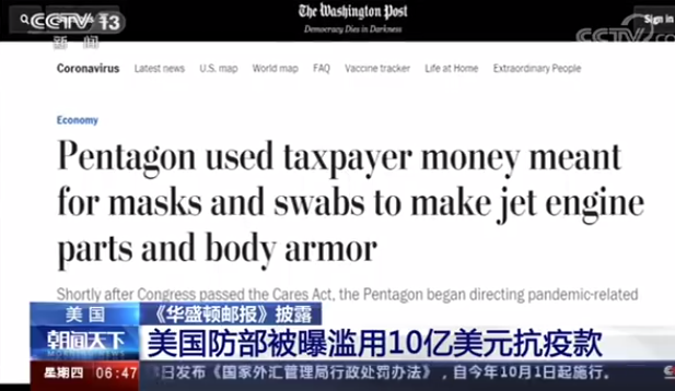 Die US-amerikanische Zeitung „The Washington Post“ berichtete am Dienstag, im März 2020 habe der US-Kongress dem Verteidigungsministerium gemäß einem inländischen Gesetz Gelder für den Kampf gegen die COVID-19-Pandemie in Höhe von einer Milliarde US-Dollar bereitgestellt. Diese Gelder seien anschließend aber zum Großteil an Verteidigungsauftragsnehmer verteilt worden, die mit der Pandemiebewältigung nichts zu tun hätten.