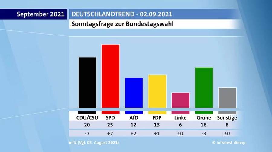 Die Wahlen zum Deutschen Bundestag finden am 26. September statt. Der Umfrage zufolge würde die SPD bei einer Wahl am 5. September 25 Prozent der Stimmen erhalten, 7,0 Prozentpunkte mehr als im vergangenen Monat. Die Koalitionspartei, die sich aus CDU und CSU zusammensetzt, würde 20 Prozent der Stimmen erhalten, 7,0 Prozentpunkte weniger als im August.