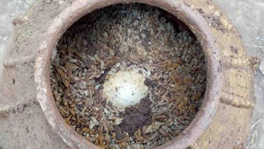 Die Eier mit intakten vollständigen Schalen wurden in dem Reis eines Kruges vergraben. Die Zahl der Eier sei bislang noch nicht überprüft worden, sagten die Forscher.