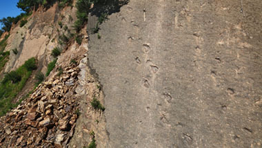 Da sich die fossilen Fußabdrücke hoch oben auf einem steilen Felsen in einem Winkel von mehr als 70 Grad befinden, mussten die Forscher anhand einer Strickleiter und eines Skilifts zur Fundstelle gelangen.