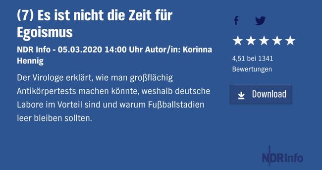 Je weiter sich das Coronavirus in Europa ausbreitet, desto mehr wollen die Menschen darüber wissen. Auf dieses Informationsbedürfnis reagiert NDR Info mit einem neuen Coronavirus-Podcast, der jeden Tag ein Update zur Situation liefert. In den vergangenen Tagen beantwortete Prof. Dr. Christian Drosten in Interviews Fragen zur aktuellen Situation, erklärt Zusammenhänge und schildert, wie er persönlich diese Tage erlebt.