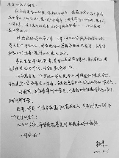 In dem Brief hieß es: „Herr Zhang, ich schenke Ihnen dieses Paket, als ob ich ein Nachbar oder ein Freund von Ihnen wäre. Die alte Kleidung meiner älteren Kinder könnte Ihrem Kind passen. Einige Snacks, die ich gerne mag, möchte ich mit Ihnen und Ihrer Familie teilen. Ich bin ein ganz normaler Bürger aus Xiamen in der südostchinesischen Provinz Fujian. Wir haben mit vielen Emotionen und Tränen die außergewöhnlichen COVID-19-Tage, die Sie und Ihre Familie durchlitten haben, aus der Ferne mitverfolgt. Das Dessert ist die Spezialität aus Fujian. Ich hoffe, wenn Sie es essen, als ob Sie in Xiamen wären und mit mir gemeinsam Tee trinken und sich unterhalten würden. Herzlichen Glückwusch und Alles Gute! Frau Yang.“