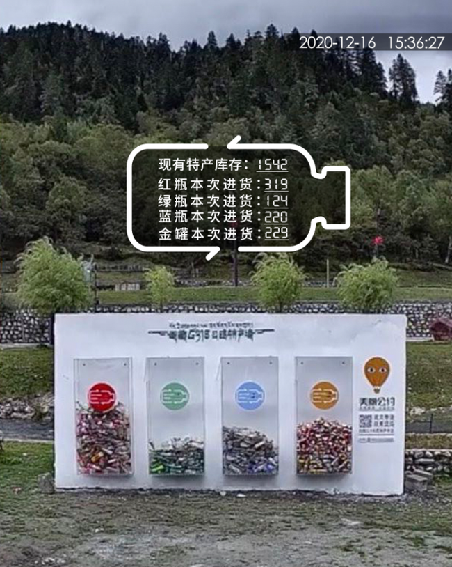An einer weißen Wand hingen vier große transparente Plastiktüten mit Flaschen und Dosen zum Verkauf. Nachdem die Freiwilligen den Müll aufgehoben hatten, sortierten sie den Müll nach dessen Farbe hinein. Mit nur 0,5 Yuan RMB konnten Internetnutzer eine Müllflasche kaufen. Die wunderschöne Landschaft im Hintergrund und der unordentliche Müll bildeten einen starken Kontrast. Die rasche Reduzierung des aktuellen Lagerbestands, die auf dem Computerbildschirm der Internutzer gezeigt wurde, gab den Menschen das Gefühl, dass man sich unbedingt um eine Flasche oder Dose reißen musste.