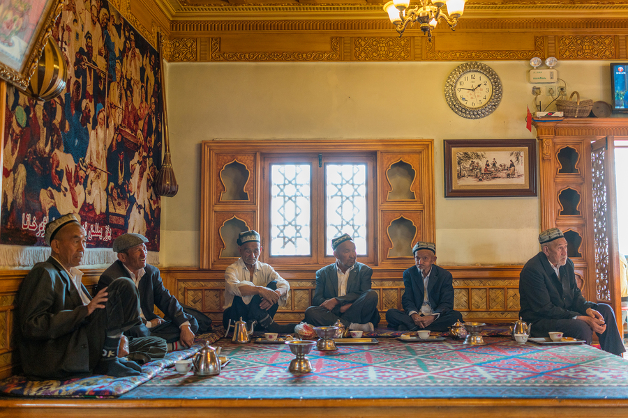 Der 80-jährige Abduresiti Alimu verkaufte in einem dem Teehaus gegenüberliegenden Laden Obst und Trockenfrüchte. Er sagt, er trinke schon sein ganzes Leben lang in dem Teehaus Tee. Seitdem er im vergangenen Jahr in den Ruhestand gegangen sei, komme er täglich ins Teehaus. „Früher war das Teehaus viel kleiner. Nun macht es ein immer besseres Geschäft.“ Der Flötenspieler Memeti Imin Ezzedzie spielt Flöte, seit er neun Jahre alt ist und lebt von dieser Fertigkeit, seitdem er 20 Jahre alt geworden war. Er sagt: „Nun spiele ich hier im Teehaus für die Gäste. Ich trinke auch gerne Tee und erhalte monatlich 3.000 Yuan RMB. Ich freue mich sehr über dieses Leben.“