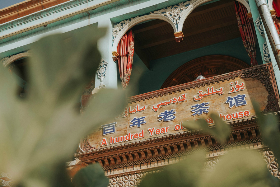 Das „A hundred Year old Tee house“ mit roten Teppichen, blauen Wänden in Kashgar im Uigurischen Autonomen Gebiet Xinjiang, hat tatsächlich eine mehr als hundertjährige Geschichte hinter sich. Dort nehmen Touristen Teetassen in die Hände, genießen mit den Einheimischen gemeinsam den leckeren Tee und die uigurischen Spezialitäten und hören sich die urigurische Musik an.