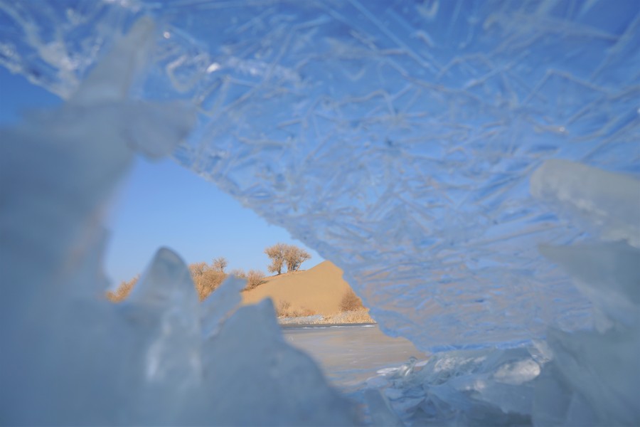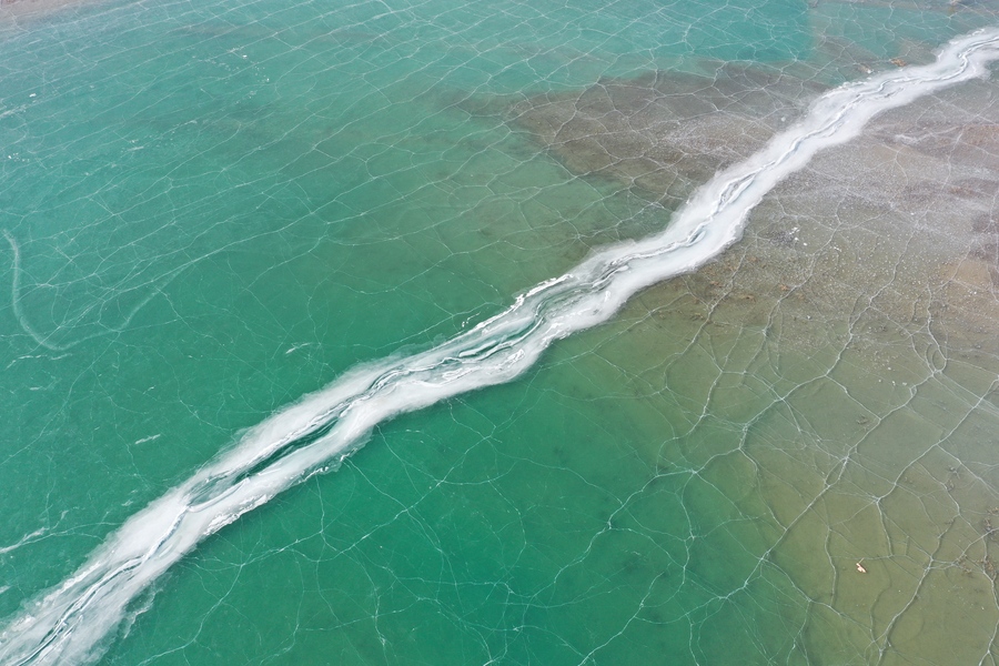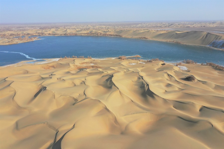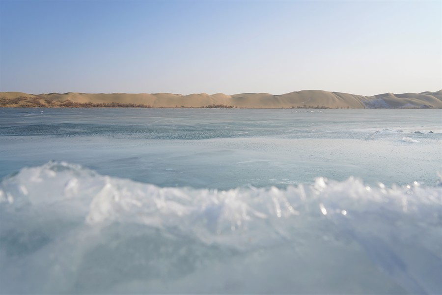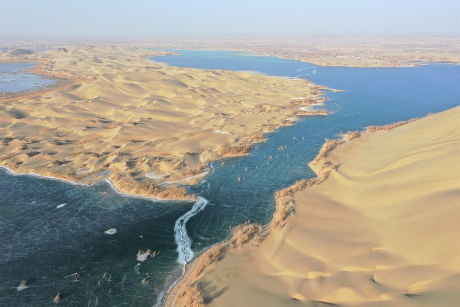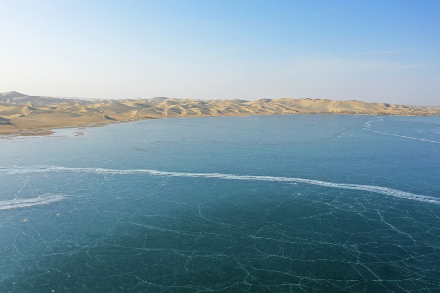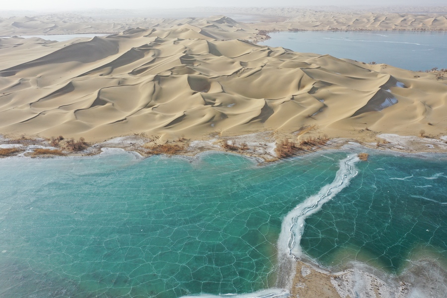 Der Luobu-See im Landkreis Weili in Bayingolin im Uigurischen Autonomen Gebiet Xinjiang ist nun durch die anhaltend tiefen Temperaturen zugefroren. Der grüne Eissee und der goldene Sand der Taklamakan-Wüste bilden zusammen eine malerische Winterlandschaft.
