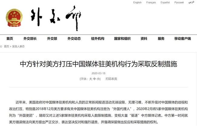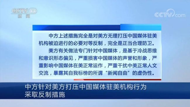 In den vergangenen Jahren hat die US-Regierung die normale Berichterstattung chinesischer Medien und Journalisten in den USA unbegründet und unvernünftig eingeschränkt und ständig die Diskriminierung sowie politische Unterdrückung gegenüber chinesischen Medien eskaliert. Dazu gehören unter anderem die diskriminierenden Einreisemaßnahmen, Visumformalitäten und Interviewsbeschränkungen gegenüber Korrespondenten aus China. Zudem hat das US-Außenministerium die US-Filialen von fünf chinesischen Medienanstalten als diplomatische Vertretungen in den Vereinigten Staaten eingestuft und sie aufgefordert, ihre Angestellten und ihr Vermögen in den USA registrieren zu lassen. Darüber hinaus gab das US-Außenministerium bekannt, dass ab dem 13. März die Anzahl der chinesischen Mitarbeiter der fünf chinesischen Medien begrenzt werden müsse. Umgehend hat China gegenüber den USA ernsthafte Einwände hinsichtlich dieser fehlerhaften Handlungsweise erhoben, diese vehement abgelehnt und scharf verurteilt. Außerdem hat sich China das Recht vorbehalten, Gegenmaßnahmen zu ergreifen. Heute werden die chinesischen Gegenmaßnahmen offiziell bekanntgegeben, was eine legale Verteidigung und eine notwendige Reaktion auf das Vorgehen der US-Seite ist. Da der Vorfall von den USA ausgelöst worden war, sind die chinesischen Gegenmaßnahmen im gleichen Ausmaß rechtmäßig und berechtigt. Gleiches wird hier mit Gleichem vergolten.