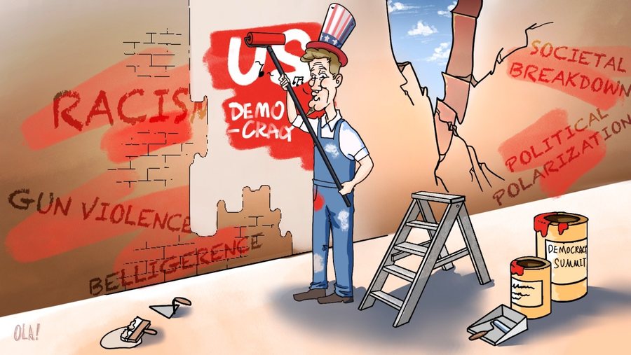 Die USA sind derzeit beschäftigt mit Organisation des sogenannten „Demokratie-Gipfels“, um sich als „Leuchtturm der Demokratie“ und „Modell der Demokratie“ zu präsentieren. In der Tat ist die „Demokratie nach amerikanischem Vorbild“ wie eine bröckelnde Mauer, und egal, wie sehr man da repariert, es wird auf keinen Fall funktionieren. Mit ihrer Manipulation des sogenannten „Demokratie-Gipfels“ treten die Vereinigten Staaten die echte Demokratie mit Füßen.