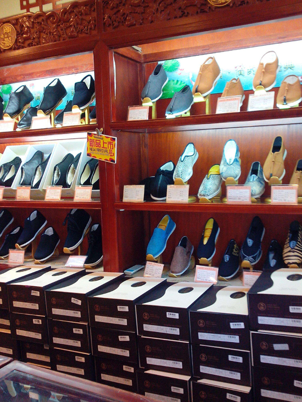Auf der Wangfujing-Straße, einer der bekanntesten und belebtesten Einkaufsmeilen Beijings, findet man Geschäfte mit den Namen „Shengxifu", „Ruifuxiang" und „Neiliansheng". Mit ihrer langen Geschichte gehören diese drei Geschäfte zu den bekanntesten des „alten Beijings". Dort werden Hüte, Stoffe für Kleider und Schuhe in erstklassiger Qualität verkauft. Man kann dort Schaffell-Hüte, Kleider im chinesischen Stil sowie handgemachte Stoffschuhe kaufen. Heute säumen auch zahlreiche Geschäfte von bekannten Marken und Fachgeschäfte die hundertjährige Einkaufsstraße.
