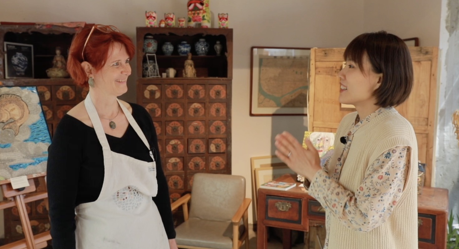 Mama Yu interessiert sich sehr für die Architektur von Gaudi aus Spanien. Im Gespräch mit der deutschen Mosaik-Künstlerin Getrud Müller, die eine Einzelausstellung in Beijing hat, erfuhr sie mehr über die Mosaik-Kunst sowie die interessanten Erlebnisse und Projekte der Künstlerin.