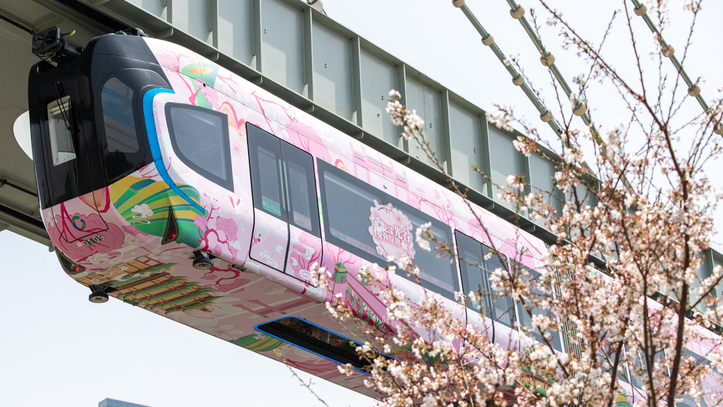 Wuhan: Einschienenbahn gleitet durch ein Meer aus Kirschblüten