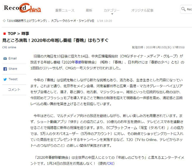 Die Frühlingsfestgala 2020 der China Media Group (CMG) wird am 24. Januar stattfinden. Die fein produzierten Programme und die Anwendung der modernen Technologien lösen weltweit eine starke Aufmerksamkeit aus. Statistiken zufolge werden in der ganzen Welt mehr als 460 Medien aus mehr als 170 Ländern und Gebieten darüber berichten.