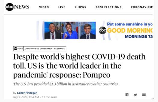 Der US-Fernsehsender American Broadcasting Company (ABC) berichtete am Donnerstag, trotz der höchsten Infektionszahl und Todesfälle habe Pompeo auf der Pressekonferenz mehrfach gesagt, das bedeute nicht, dass die USA kein „führender Leiter im Kampf gegen die COVID-19-Epidemie“ seien. Die ganze Welt erwarte von US-Wissenschaftlern und -Experten, dass sie eine Therapie gegen COVID-19 finden und den Entwicklungsländern helfen würden, so Pompeo weiter.