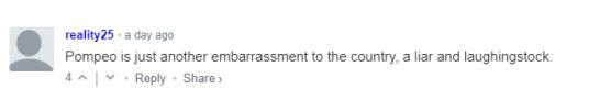 Pompeos Aussagen sind von zahlreichen Internetnutzern online scharf kritisiert worden. Einige Personen bezeichneten den US-Außenminister auch als „nationale Schande“.