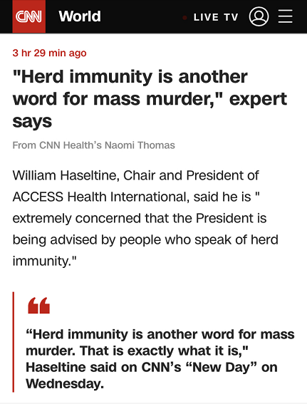 Der US-Wissenschaftler William A.Haseltine sagte in einem Interview mit den US-Medien am Mittwoch, er sei sehr besorgt über den Begriff „Herdenimmunität“. Für ihn sei das Wort „Herdenimmunität“ eine andere Ausdrucksweise für Massaker.