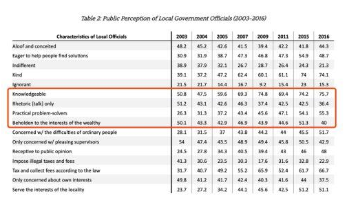 Darüber hinaus sei eine positive Entwicklung der Wahrnehmung von lokalen Beamten beobachtet worden, die von immer mehr Menschen als „kenntnisreich“ und als „Problemlöser“ angesehen werden.