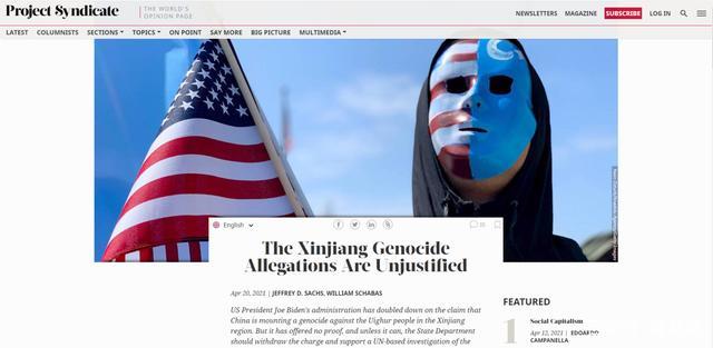 Am 20. April hat die amerikanische Webseite „Project Syndicate“ in einem Beitrag mit dem Thema „The Xinjiang Genocide Allegations Are Unjustified“ darauf hingewiesen, dass die von den USA vorgelegten Vorwürfe über „Genozid“ in Xinjiang völlig unbegründet seien. Dieser Beitrag wurde von Prof. Jeffrey Sachs von der amerikanischen Columbia University und Prof. William Schabas von der Middlesex University gemeinsam verfasst.