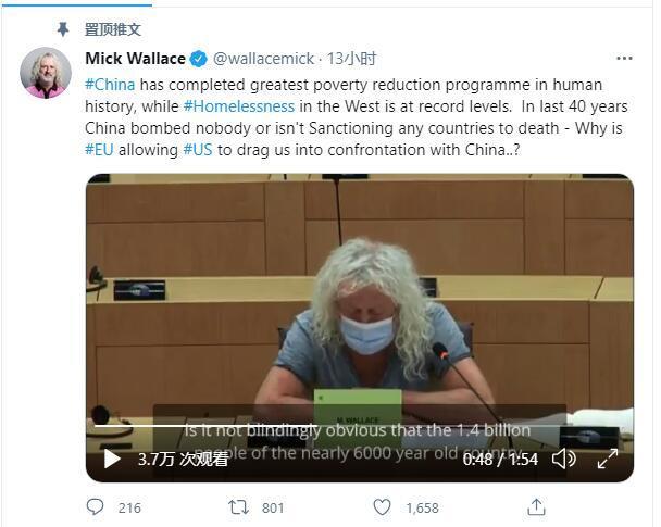 Mick Wallace, ein Mitglied des Europäischen Parlaments aus Irland, hat vor kurzem ein Videostream zum Thema China auf seinem Social Media Account gepostet, das für breite Aufmerksamkeit globaler Netizens gesorgt hat. In dem Video listete Wallace Chinas Errungenschaften bei der Entwicklung in den vergangenen dutzenden Jahren auf und forderte Europa dazu auf, die Zusammenarbeit mit China auszubauen. Europa dürfe nicht von den USA an der Nase herumgeführt werden und mit China auf Konfrontationskurs gehen, so Wallace weiter.