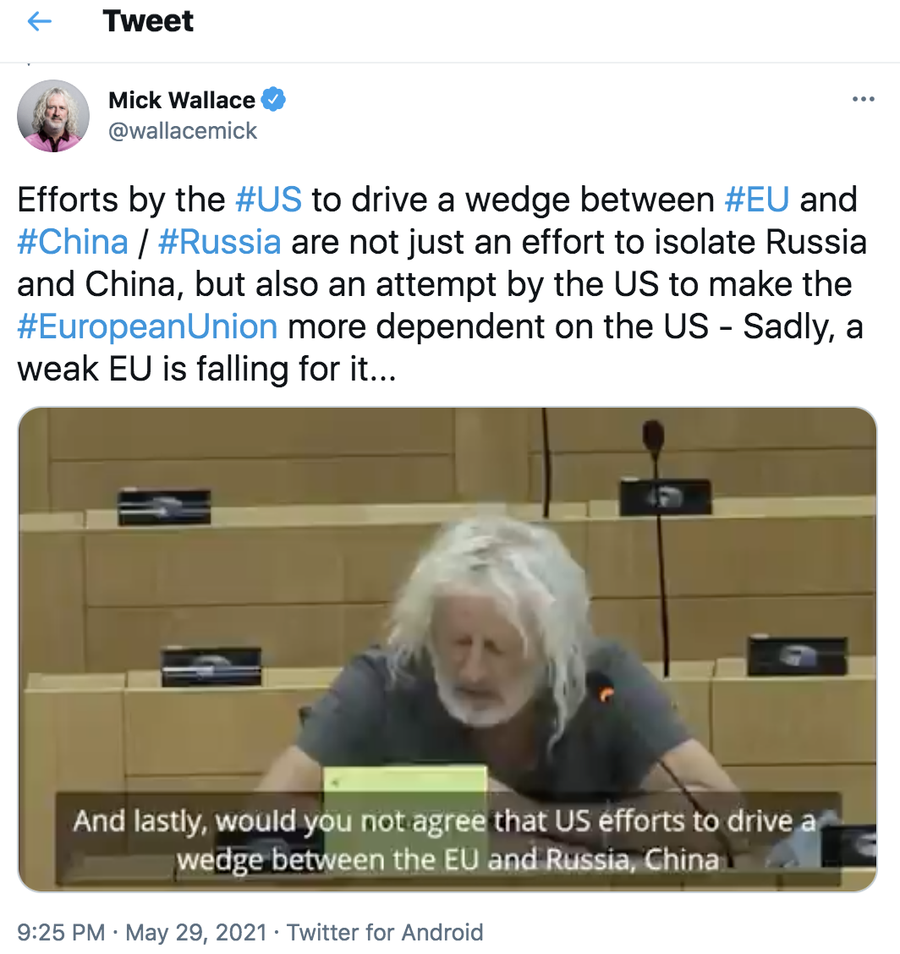 Am Samstag hat Mick Wallace, ein Mitglied des Europäischen Parlaments, auf seinem Twitter-Account ein Video seiner Rede im Parlament veröffentlicht. Dabei sagte er, die Aufhetzung der Beziehungen zwischen der EU sowie Russland und China durch die USA ziele nicht nur darauf ab, China und Russland zu isolieren, sondern es werde auch versucht, die EU noch stärker von den USA abhängig zu machen. Die EU sei in diese Falle geraten.