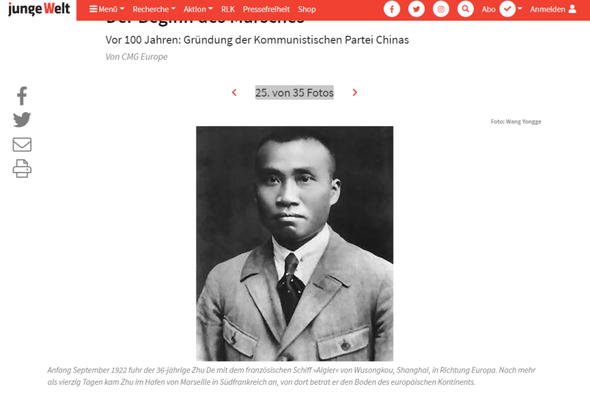 Die Fotoausstellung "Vor 100 Jahren: Gründung der Kommunistischen Parei Chinas ", die von der China Media Group Europe (CMG Europe) und lokalen Medien gemeinsam geplant und produziert wurde, ist am Donnerstag (Ortszeit) in Deutschland und Frankreich online gegangen. Die Fotoausstellung, die von der deutschen Zeitung „junge Welt“ und dem Chinesischen Kulturzentrum in Paris online organisiert wurde, zeigt anhand von 35 historischen Bildern systematisch die Erfahrungen der Führungspersönlichkeiten der KP, darunter Deng Xiaoping, Zhou Enlai und Zhu De, die während ihres Studiums und Arbeitsaufenthaltes in Frankreich und Deutschland ihre kommunistischen Überzeugungen festigten, der Kommunistischen Partei Chinas beitraten und sich an revolutionären Aktivitäten beteiligten.