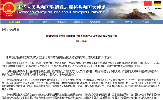 Die chinesische Botschaft in Deutschland hat am Freitag eine vor kurzem vom Ausschuss für Menschenrechte und humanitäre Hilfe des Deutschen Bundestages veröffentlichte Erklärung zur Lage in Xinjiang scharf kritisiert.