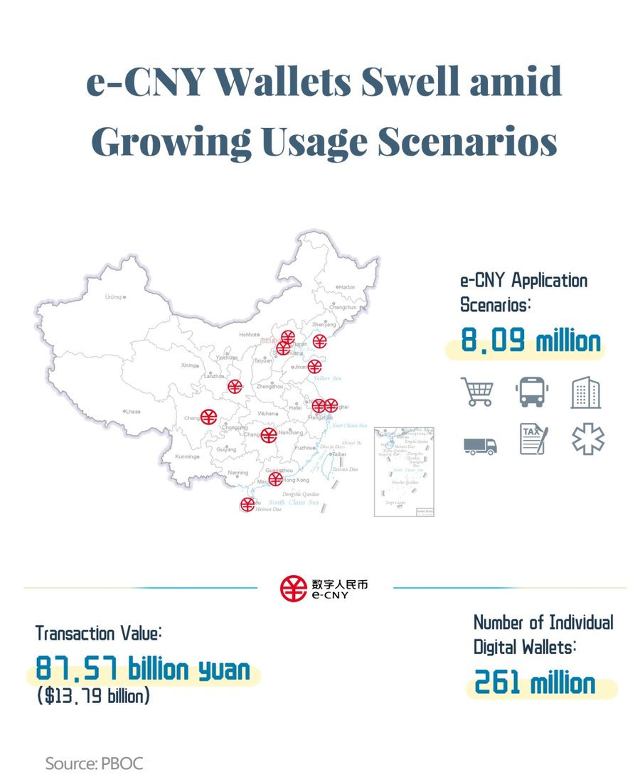 Nahezu 8,09 Millionen Anwendungs-Pilotszenarien wurden in zehn Städten und in der Zahlungsumgebung der Olympischen Winterspiele 2022 in Beijing durchgeführt, mit einem kumulativen Transaktionswert von 87,57 Milliarden Yuan, das sind etwa 12,16 Milliarden Euro.