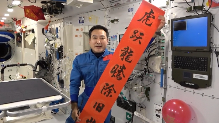 Ein von der China Media Group CMG veröffentlichtes Video zeigt, dass die Taikonauten der Shenzhou-13-Besatzung das Innere der Raumstation bereits mit Luftballons und traditionellen roten Papierquadraten geschmückt haben. Zhai Zhigang, eines der Crewmitglieder, schrieb mit einem Pinselstift...