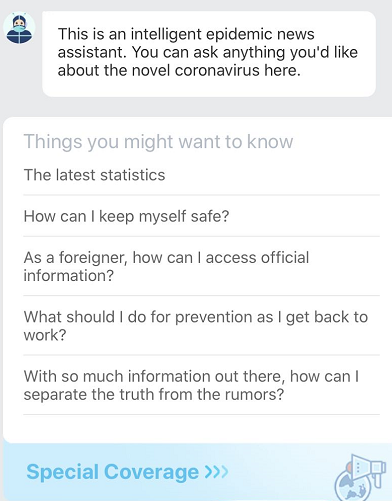 Nutzer der App können sich im Gespräch mit dem Roboter über das Coronavirus informieren, darunter die jüngsten Entwicklungen der Pandemie und bestehende Regelungen zur Vorbeugung und Kontrolle der COVID-19-Lungenkrankheit.