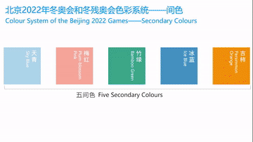 Die Wahl der Farben wurde von den Farben des Winters und den kulturellen Farbcodes in den drei Wettbewerbsregionen abhängig gemacht. Der Bezug zu den vier Jahreszeiten ist ebenso gegeben, sowie zur Harmonie von Himmel und Erde und den 24 traditionell chinesischen Jahresabschnitten. Das Farbsystem verkörpert nicht nur Wintersport, Ökologie und High-Tech bei den Olympischen Spielen, sondern auch den einzigartigen Charme der chinesischen Kultur.