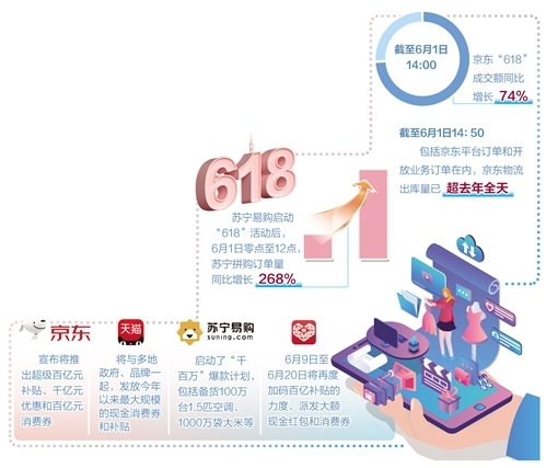 Durch die Vorfreude auf „618“ wurden die Leidenschaft und das Konsumpotential der chinesischen Verbraucher bereits Anfang Juni stimuliert: Von Mitternacht des 1. Juni bis 14:00 Uhr waren die Verkaufsumsätze von JD bereits 74 Prozent höher als im Vorjahr. Die Verkaufszahl von Fernsehern mit Bildschirmen über 70 Inch von Suning war von Mitternacht bis 12:00 Uhr 360 Prozent höher im Vorjahr, während die Suning-Bestellungen aller Produkte landesweit um 268 Prozent im Vergleich zum Vorjahr gestiegen waren.