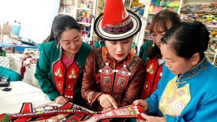 Zhu Fengzhi, 55 Jahre alt, hält eine Sticknadel mit Faden in der Hand, um die Farbe abzustimmen. Sie beendet gerade einen Stickerei-Kurs im autonomen Kreis Sunan Yugu, Stadt Zhangye, Provinz Gansu. Ihr Identitätswechsel von der Hirtin zur Stickerin verändert still und leise ihr Leben...