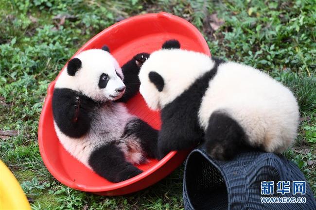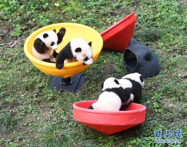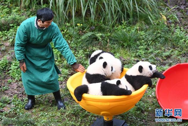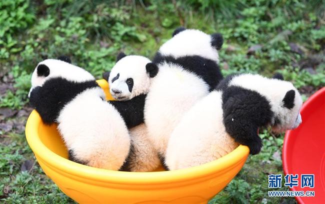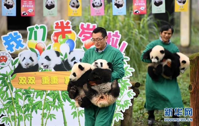 Vier kleine Pandabären im Zoologischen Garten Chongqing wurden am 22. Dezember dem Publikum präsentiert. An diesem Tag wurde ihr sechsmonatiges Panda-Leben gefeiert. „Shuang Shuang“, „Chong Chong“, „Xi Xi“ und „Qing Qing“, deren Namen zusammen „verdoppelte Freude“ bedeuten, spielten freudig in der Panda-Halle und verbrachten den Tag der Sonnenwende „Dong Zhi“ gemeinsam mit den Besuchern.