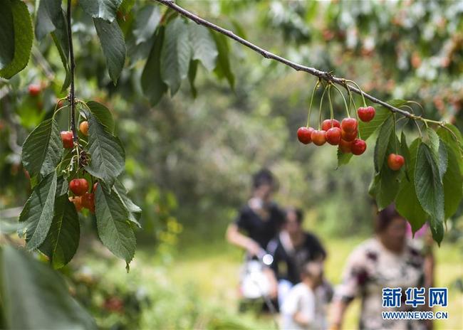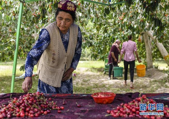 Am 25. Mai verkauften die lokalen Landwirte Kirschen in einem Kirschgarten im Dorf Xiamalebage im Landkreis Yarkant im westchinesischen Uigurischen Autonomen Gebiet Xinjiang. Jetzt Ende Mai sind rote Kirschen an den zahlreichen Kirschbäumen in dem großflächigen Kirschgarten in Yarkant reif, die viele Touristen zum Besuch und Pflücken der frischen Früchte anlocken. Der Kirschanbau hat den lokalen Landwirten schon sehr bei der Armutsbekämpfung geholfen.