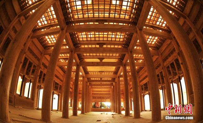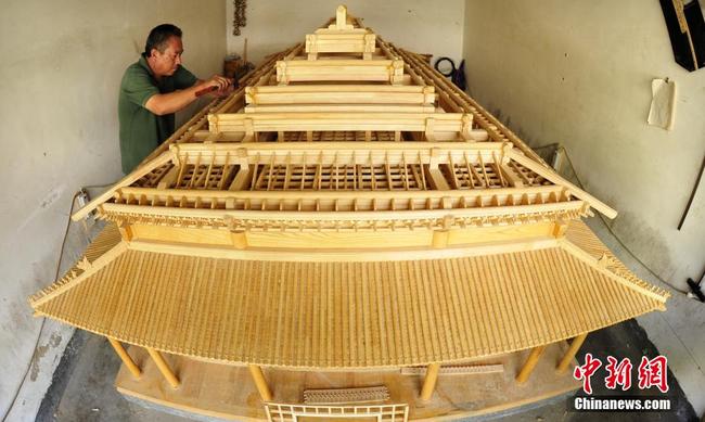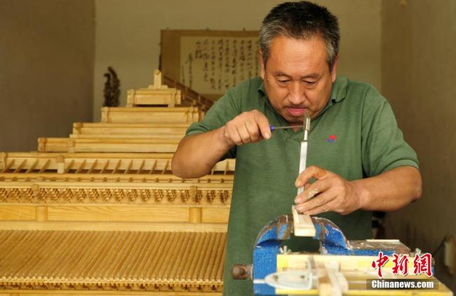 Der 49-jährige Dou Jinchao ist Tischler. Er ist vom Zimmerei-Handwerk besessen. 2014 beschloss er, innerhalb von zehn Jahren ein Modell der Taihe-Halle in der Verbotenen Stadt im Verhältnis 1:18 herzustellen.