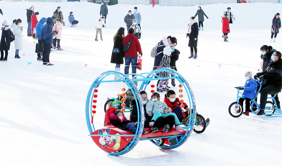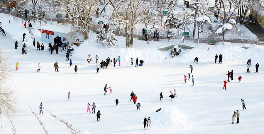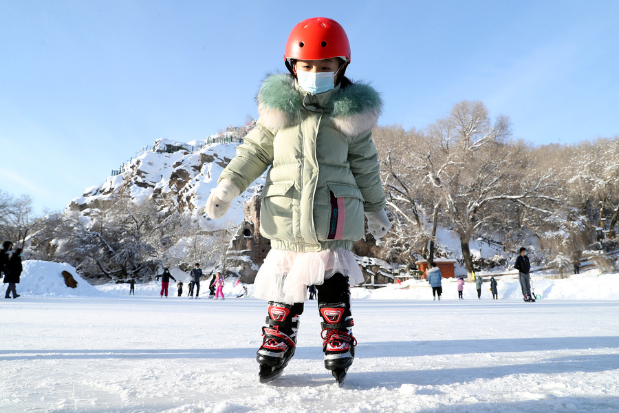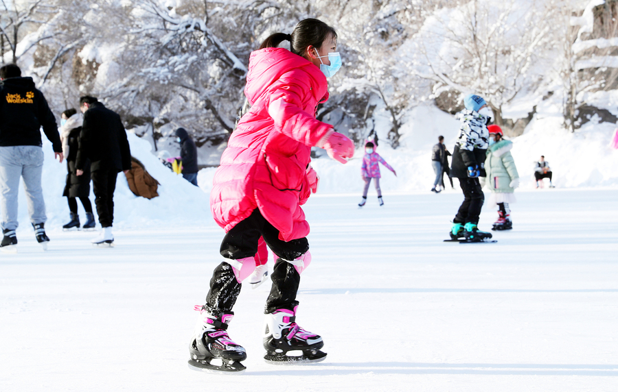 Die Schüler der Stadt Ürümqi im Uigurischen Autonomen Gebiet Xinjiang genießen in Begleitung ihrer Eltern Wintersport in der lokalen Eisbahn und dem Skigebiet der Region. (Fotos von VCG)