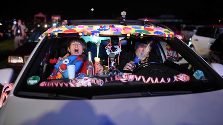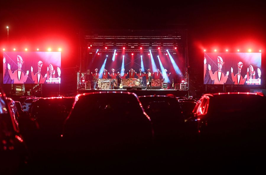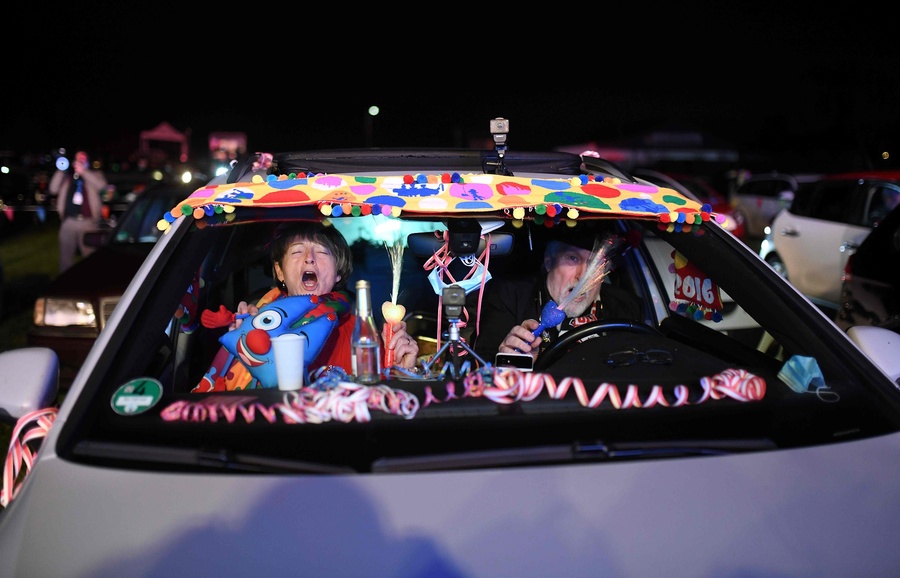 Diese Fotos zeigen einen Drive-in-Karneval am 5. Februar im deutschen Monheim. Aufgrund der Prävention der COVID-19-Pandemie haben die Veranstalter zwei Großleinwände aufgebaut, damit die Karnevalisten die Konzerte bekannter Bands für Karnevalsmusik aus ihren Autos heraus verfolgen konnten. (Foto: VCG)