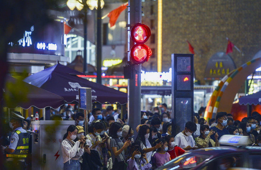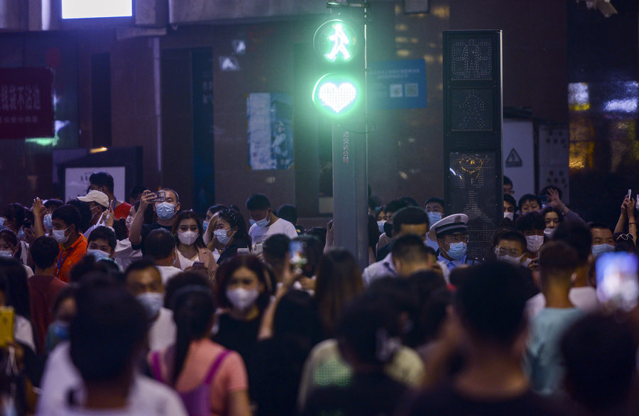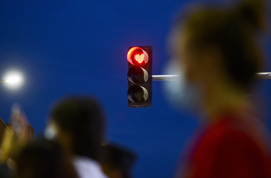 Am Qixi-Fest am 14. August – Chinas Valentinstag – zeigte die Anzeige der Verkehrsampel an einer Kreuzung in Urumqi, Xinjiang, ausnahmsweise eine Herzform und feierte so den Tag der Liebe mit. (Foto / VCG)