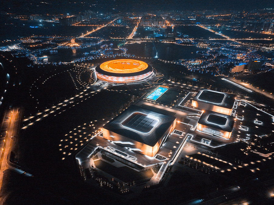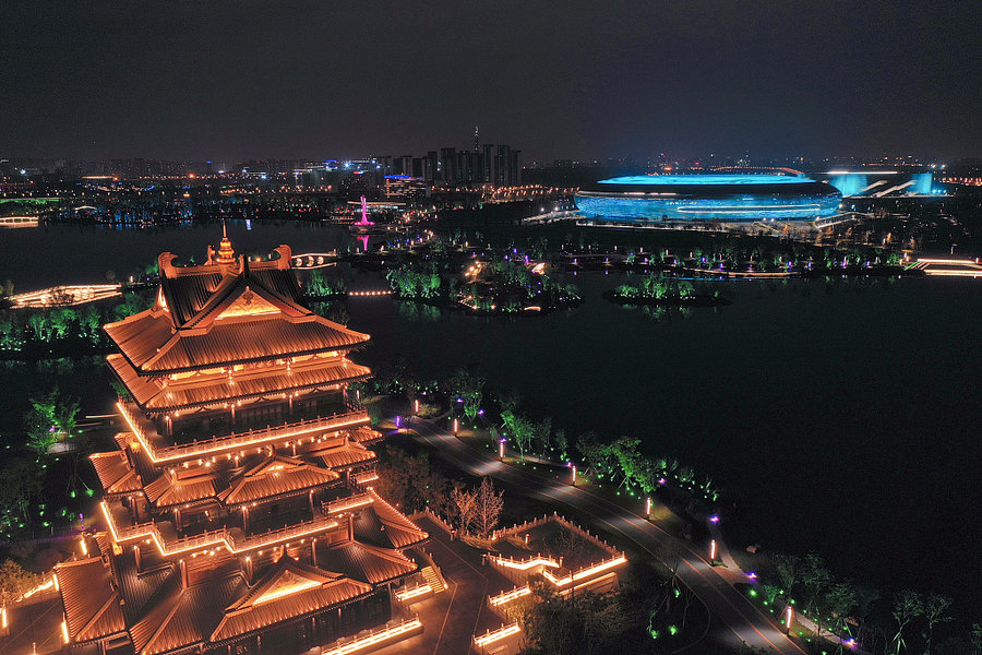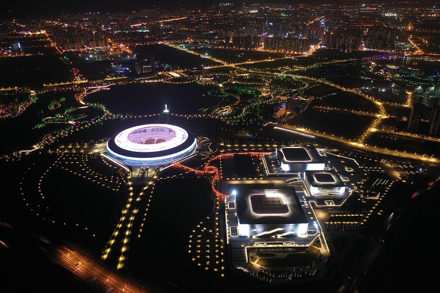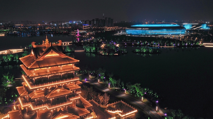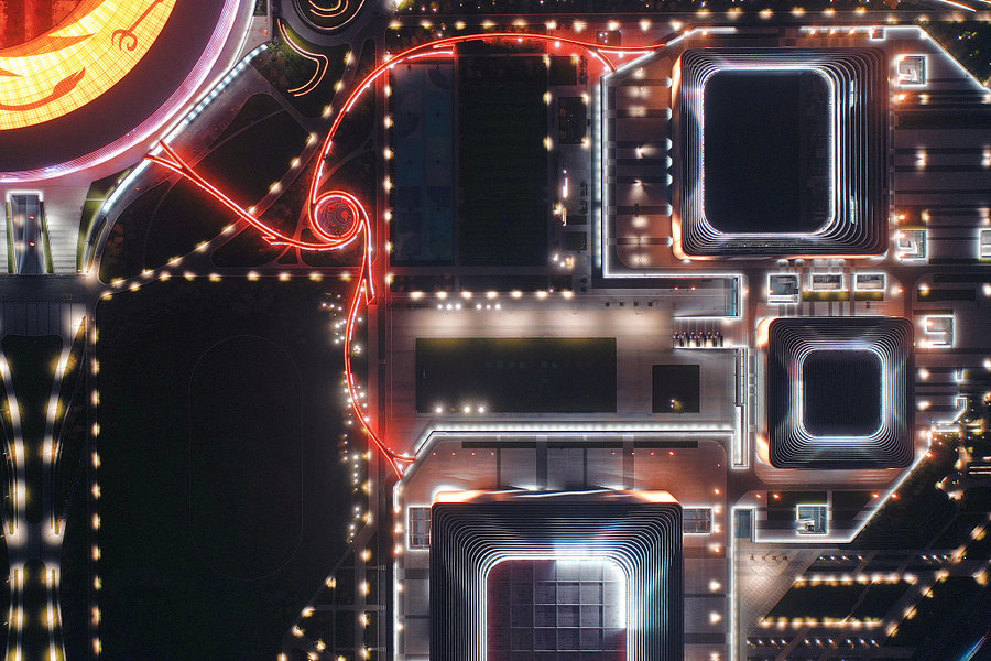 Im Park Dong'an Lake in Chengdu (Provinz Sichuan) wurde vor kurzem der Fackelturm mit Lichtern bunt beleuchtet. Aus der Vogelperspektive sieht die Stadt bei Nacht wunderschön aus.