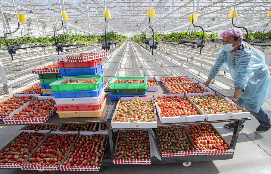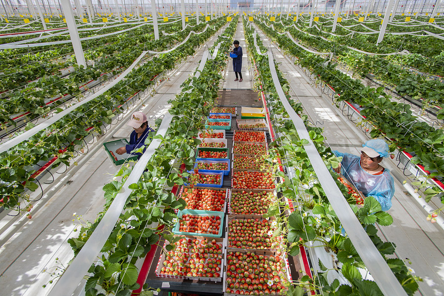 Ein Gemüsebaubetrieb in der Stadt Tongchuan in Nordwestchina heizt seine Erdbeere-Gewächshäuser mit Abwärme eines Kraftwerkes. Seit Ende 2021 wurden rund 80 Tonnen Erdbeeren gepflückt und in alle Landesteile geliefert. (Foto / VCG)