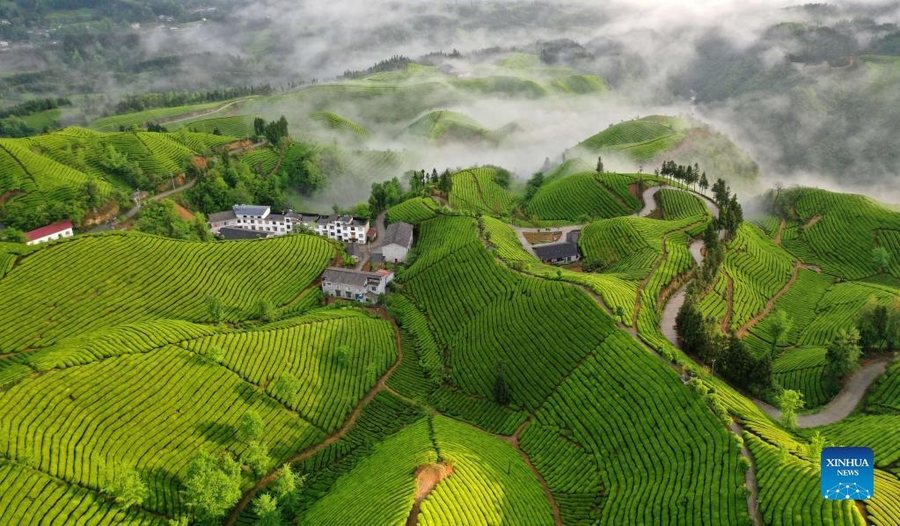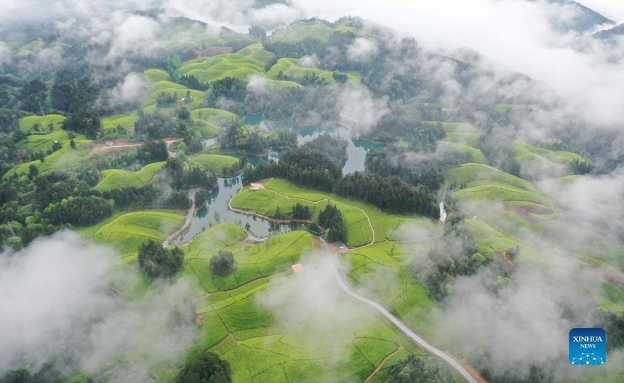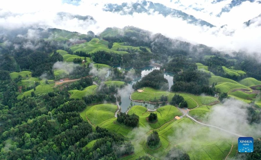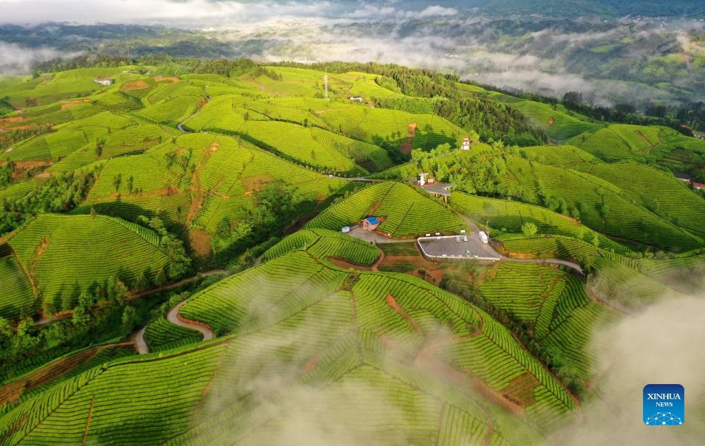 Die grüne Teeplantage in Enshi, einer autonomen Präfektur der Tujia und Miao in Zentralchina, erstreckt sich bis zum Horizont und sieht wie ein grüner Teppich auf dem Boden aus.