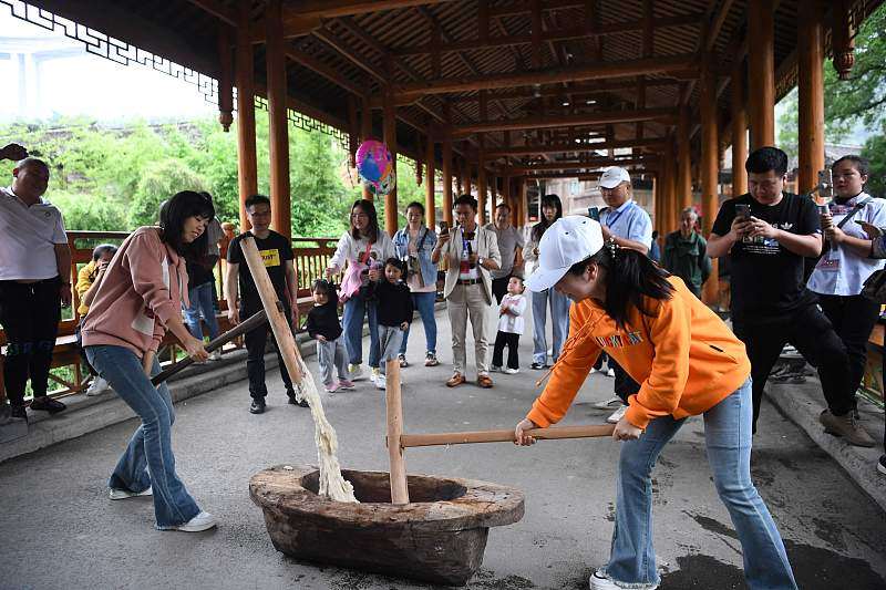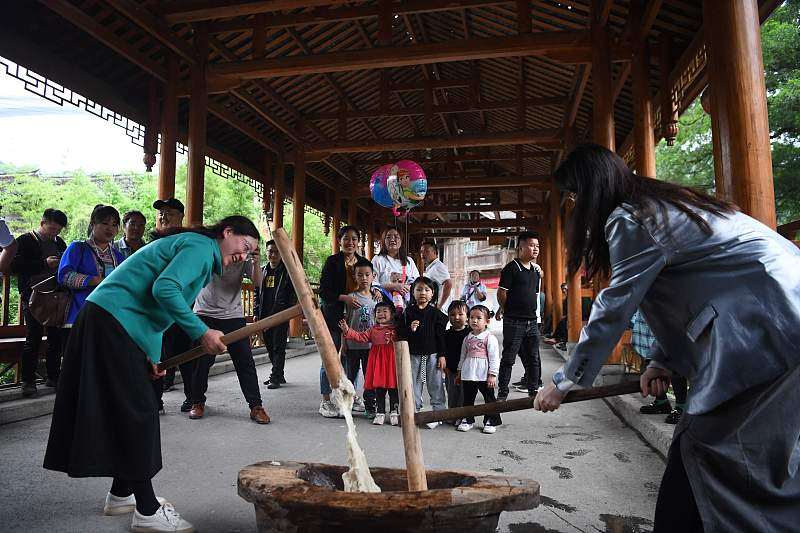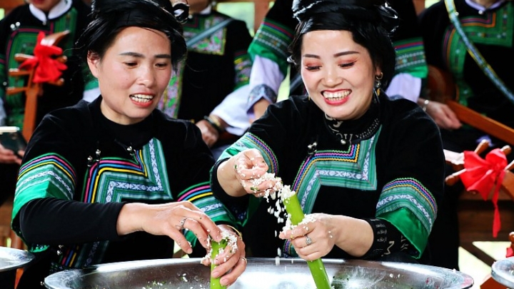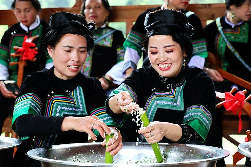 In der Autonomen Präfektur Qiandongnan der Miao und der Dong in der Provinz Guizhou wurde am Samstag das traditionelle Bambus- und Reisfest gefeiert. Die lokalen Menschen in traditionellen Trachten haben den Bambusreis zubereitet.