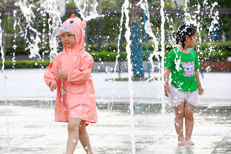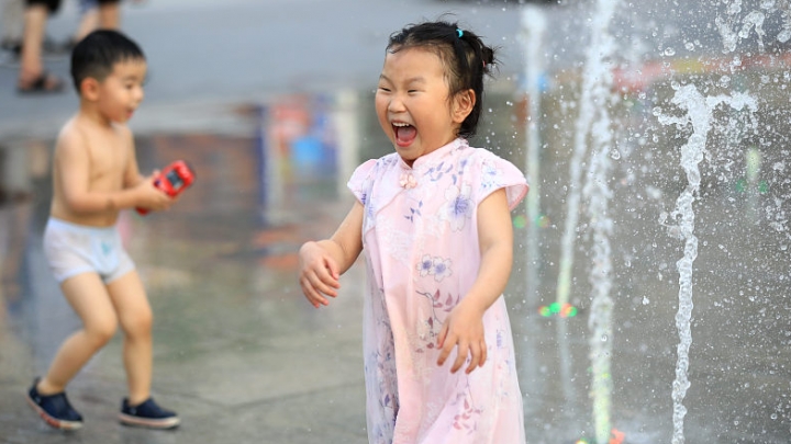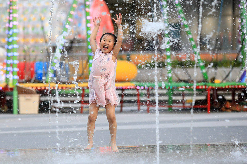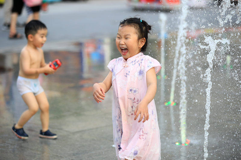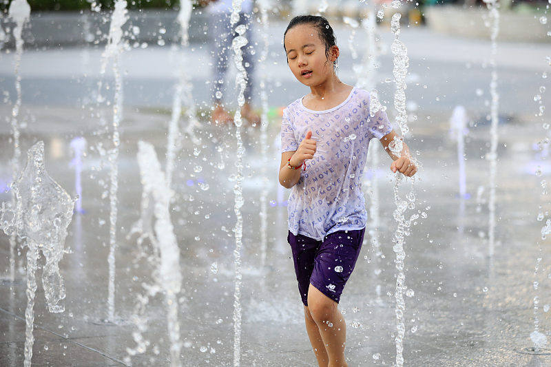 In der Stadt Huai'an in der Provinz Jiangsu herrschten vor kurzem hohe Temperaturen. Um sich bei der Hitze abzukühlen, spielten die Kinder im Wasser der Musikbrunnen.