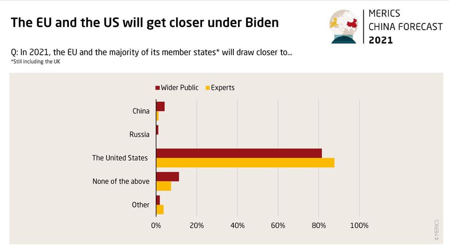 Nach dem Machtwechsel im Weißen Haus wird die neue US-Regierung die USA höchstwahrscheinlich wieder auf die Bahn des Multilateralismus zurückbringen. Den Untersuchungen des Mercator-Instituts zufolge meinten 80 Prozent der Befragten, dass sich die EU-Länder den USA annähern würden. Beim Umgang mit den USA plädiert China kontinuierlich dafür, kein Konflikt oder keine Konfrontation zu betreiben und gegenseitigen Respekt, Zusammenarbeit und gemeinsamen Gewinn anzustreben. Beijing sucht nicht nach Konfrontation mit Washington. Deshalb ist es auch nicht notwendig, Brüssel zur Wahl seiner Position aufzufordern.