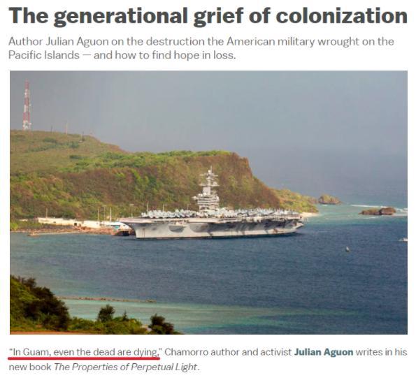 Der chamorrostämmige Schriftsteller in Guam, Julian Aguon, hat in seinem neuen Buch „The Properties of Perpetual Light“ darauf hingewiesen, dass die Natur in Guam aufgrund der immer stärkeren Militarisierung der USA schwer geschädigt worden sei. Die Chamorros könnten gegenüber der Verletzung ihrer eigenen Rechte und Interessen nichts tun: Auf der Insel Guam „sterben selbst die Toten“, stellt er resignierend fest. (In Guam, even the dead are dying)