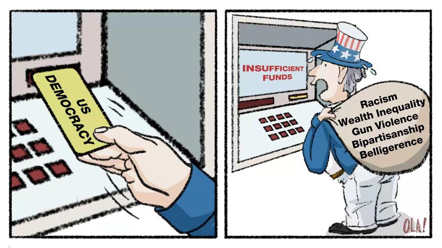Auf internationaler Ebene haben sich die USA unter dem Deckmantel der „Demokratie“ wiederholt in die inneren Angelegenheiten anderer Länder eingemischt, die regionale Stabilität untergraben und die internationale Sicherheit bedroht. Doch vom Irak über Syrien bis nach Afghanistan hat sich immer wieder gezeigt, dass die USA der Welt nicht Frieden und Wohlstand, sondern Aufruhr und Katastrophen beschert haben, indem sie der Außenwelt ihre „Demokratie“ aufzwangen. Die Vereinigten Staaten sind ein Kreditnehmer, der sein Konto an Demokratie überzogen hat. Die „Demokratie amerikanischer Prägung“ ist längst bankrott.