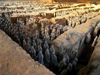 Die Terrakotta-Krieger, die im Jahr 1974 ausgegraben wurden, dienten symbolisch zum Schutz der Grabstätte des Ersten Kaisers, die mehrere Kilometer entfernt liegt. Aus Furcht vor Schäden im Innenraum wurde das Grab von Qingshihuang bislang noch nicht geöffnet.